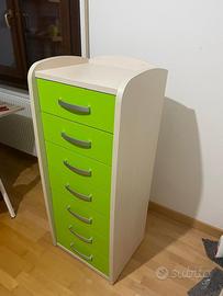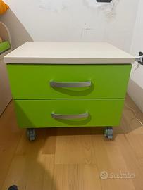 Cameretta bambino cassetti colore verde menta fianchi e top faggio chiaro in buono stato composta da: Letto con ruote con 2 capienti contenitori Comodino con ruote 2 cassetti Settimanale Materasso in regalo