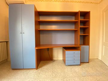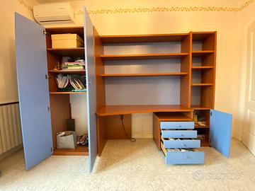 Armadiatura composta da mensole, cassettiera, scrivania di grandi dimensioni, armadio sulla sinistra utilizzabile come armadio per vestiti o come ulteriore scaffalatura chiusa (è presente sia il bastone appendiabiti che le mensole) e un altro sportello chiuso con doppio scomparto. Libreria molto grande di ottima qualita, estremamente resistente e tenuta benissimo. Per ulteriori informazioni contattatemi pure