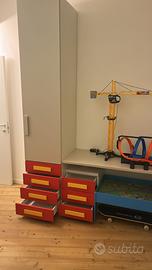 Cameretta con doppia anta di armadiatura, 7 cassetti, scruvania amoia, conodino con due cassetti, letto a castello con doppia postazione letto al piano di sotto e una postazione al piano di sopra, scala con 3 cassetti grandi a contenitore