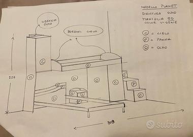Colore azzurro cielo panna e olmo. Struttura in legno olmo come da foto. Con soppalco con scalini. Un letto singolo e uno piazza e mezza. La camera e come da disegno del progetto la foto catalogo l’ho messa x far vedere il modello e i colori cambia solamente l armadio. 800€ senza il letto da una piazza e mezza e materasso con 1000€