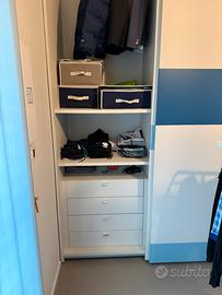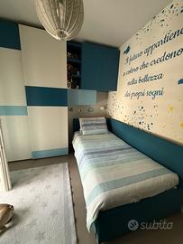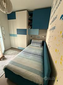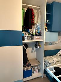 Composizione cameretta bambino Moretti Compact (letto non incluso), formata da armadio modello slider frame con ante scorrevoli in laminato (largh. cm 156, alt. cm 265, prof. cm 65) con cassettiera interna, mensole (cm 34), un pensile con chiusura a vasistas (azzurro chiaro - cm 77), un pensile con ante a battente (blu - cm 96), una scrivania (largh. 110 cm, prof. max 60) ed una sedia.