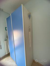 Cameretta marca San Martino composta da: -Letto ad una piazza (singolo): misure 200 cm L x 90 cm P x 80 cm H (testiera) -Armadio: misure 120 cm L x 60 cm P x 225 cm H -comodino: misure 47x50 cm Letto con rete integrata con doghe in legno e bordo in metallo; Armadio con due ante scorrevoli, con 4 cassetti interni a chiusura rallentata e due ripiani; Comodino con due cassetti rallentati; Due mensole con due e tre spazi ciascuna per appoggiare oggetti. La camera è pari al nuovo perché mai utilizzata. Colore azzurro acceso e bianco ghiaccio con venature effetto legno. Si vende completa di ogni sua parte, GIÀ SMONTATA e IMBALLATA. Ritiro a carico dell’acquirente. Per informazioni o altre foto contattare via messaggio su subito