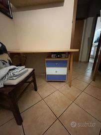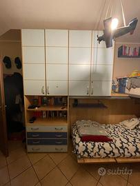 Comorende letto a castello, due armadi, scala con cassettoni, due comodini di diverse grandezze, libreria, cassettoni.