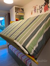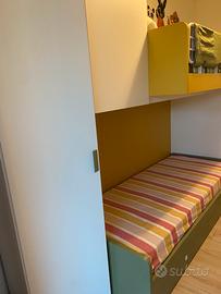 Cameretta marca Battistella con letti a castello, in ottime condizioni due colonne armadio e un’anta con ripiani e cassettiera all’interno. Due cassettoni sotto il letto e cassetti lungo le scale. Sistema di ribalta per agevolare la messa in ordine del letto superiore.