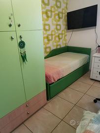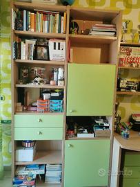 Cameretta modello Berloni , composta da doppio letto estraibile, doppia scrivania ruotabile con cassettiera, armadio a 4 ante e due cassettoni per vestiti e vano posteriore per alloggio cuscini, libreria con ante e cassetti più spazi a giorno, serie di mensole con cassettini .