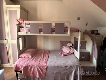 cameretta con letto una piazza e mezza ( solo doghe) al piano inferiore, letto singolo al piano superiore, materasso incluso, scaletta contenitore.