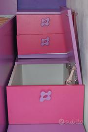 Letto rosa-viola lunghezza m. 2.10, larghezza m. 1,40, altezza m. 1,68 con materasso rete a doghe scaletta con tre cassetti e una botola e comodino con due cassetti. Due mensole con disegno di albero.