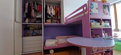 Vendiamo la cameretta delle nostre bimbe, acquistata nuova in mobilificio della zona c.ca 7 anni fa. La camera è composta da letto a castello (quello sotto con ruote per essere comodamente spostato), un comodino con 2 cassetti, una scrivania con libreria. una sedia con rotelle ed un armadio in parte a ponte. L'armadio al suo interno ha i cassetti e nella parte più alta ha il sistema a "saliscendi", che permette di abbassare e alzare l'asta appendiabiti.
