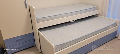 cameretta con due letti retrattili ottima qualità condizioni perfette -no ikea- compresi materassi usata pochissimo estensione mt 2,60 altezza. 2,60 larghezza, i letti sono da 195x 80 colre bianca azzurra sono in alloggio estivo zona Jesolo Lido.