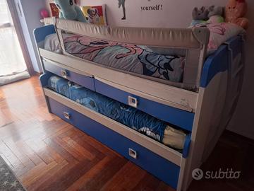 Cameretta bimbi con ponte. Ottime condizioni. Due letti più terzo letto estraibile. Unici due difetti, una maniglia da cambiare e alcune doghe secondo letto da sostituire. Smontaggio e trasporto a carico dell acquirente. Pagata 2100 da MondoConvenienza