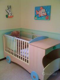 Cameretta Pali composta da letto trenino modificabile, scrivania cassettiera con fasciatoio, mensola, lampada da terra e pancha con porta oggetti.