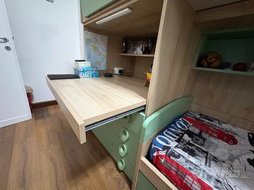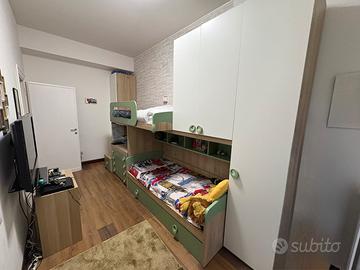 Cameretta bimbi, tre letti, come nuova, 460 cm lineare, armadio una anta, scrivania, doppia anta contenitore e secondo armadio una anta. Completa di Libreria 130x60 e mobile tv con cesti contenitori.