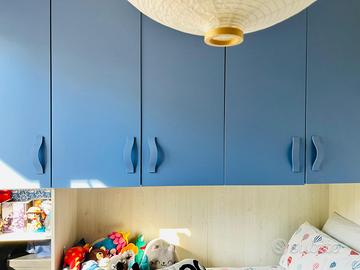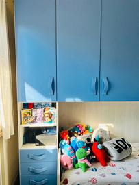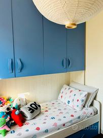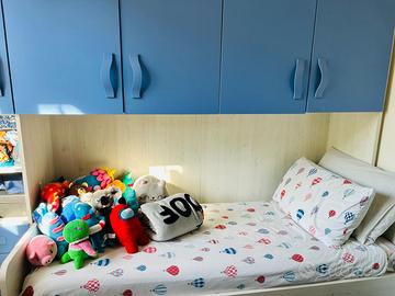 Letto contenitore con n. 2 reti con doghe in legno e n. 2 materassi (quello inferiore estraibile da cassetto non è mai stato utilizzato). Armadio a ponte con n. 2 ante doppie e n. 1 anta singola, piccola scaffalatura e n. 3 cassetti. Luci al led nella parete sopra il letto. Ottimo stato sia della parte in legno che dei materassi.