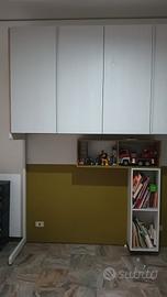 la camera comprende pensili superiori chiusi e aperti e letto con materasso
