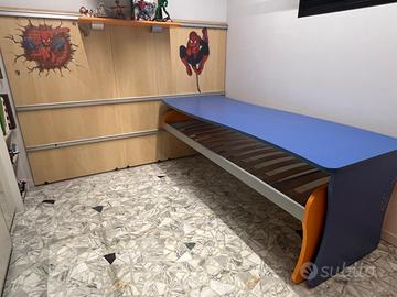 Bellissima cameretta in legno composta da parete attrezzata con letto, scrivania, comodino e mensola scorrevoli e libreria. Il letto ha doghe in legno e dimensioni 200x82cm; la scrivania ha dimensioni 210cm di lunghezza, 80cm di profondità e 77cm di altezza; la mensola ha dimensioni 90x25cm; il comodino ha dimensioni 45x24x13cm. La parete ha dimensioni 220cm di lunghezza e 161cm di altezza ed è caratterizzata da due disegni di spiderman che, volendo, possono essere rimossi. La libreria ha dimensioni 142lunghezza, 198altezza e 35profondità. La cameretta è in legno, con rifiniture di pregio. Perfetta in ogni sua parte.