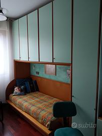 Cameretta a due ponti in legno di betulla e laccata, struttura del ponte in ferro, un ponte con letto e l'altro con divano letto. Scrivania con libreria e mobile porta tv.