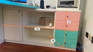 Vendo cameretta completa in condizioni eccellenti, caratterizzata da una fattura di alto livello (ben superiore agli standard dei grandi magazzini economici). I mobili sono realizzati con pannelli di spessore maggiorato e ferramenta professionale, garantendo una solidità e una durata nel tempo eccezionali. Il set include un capiente armadio a 4 ante (261x190 cm), un’ampia scrivania angolare (140x70 cm) con moduli contenitori e una zona notte con comodino e librerie a colonna coordinate. Design vivace panna/acquamarina/rosa, perfetto per studio e gioco. Un arredo solido e stabile, ideale per chi cerca qualità artigianale e non prodotti "usa e getta".