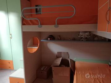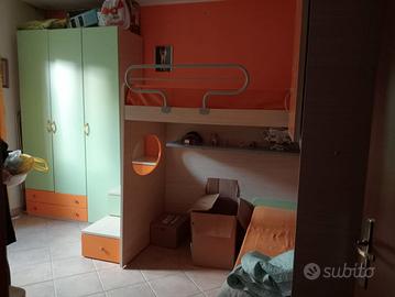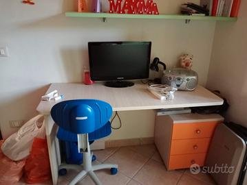 Armadio 3 ante con 2 cassetti 4 scalini cassetti 2 letto mensola sopra letto più armadio piccolo a 2 ante. Scrivania con cassettiera 2 mensole sedia con rotelle