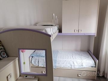 Vendo splendida cameretta per bambini/ragazzini comprata nuova e usata per 6 anni solo nei due mesi estivi. La cameretta è in perfette condizioni e si compone di tre letti: uno principale, uno sopra il ponte e uno a scomparsa sotto il letto principale. Ci sono due armadi, uno grande con doppia anta e 4 cassetti e uno più piccolo con doppia anta posizionato sopra il letto principale. L accesso al letto a castello avviene per il tramite di una scala di cestoni estraibili. A completamento della dotazione c'è una libreria verticale, una cassettiera con rotelle, una lampada a fiore e due materassi. Cedo il tutto per passaggio ad un mobilio per adulti. Smontaggio e trasporto a carico dell acquirente. Grazie