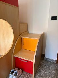 Colori vivaci (arancio, rosso, giallo) con struttura in legno chiaro, ideale per una stanza allegra e funzionale.