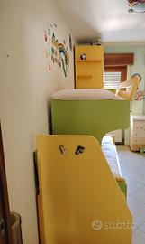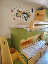 Vendesi cameretta di ottima fattura e in ottimo stato causa trasferimento. Misure ingombro max 320x90 e armadio 60x60. Letto superiore mobile servito da scala dotata di n. 2 box contenitori. Letto inferiore mobile dotato di n. 2 cassettoni. Da ritirare in loco.