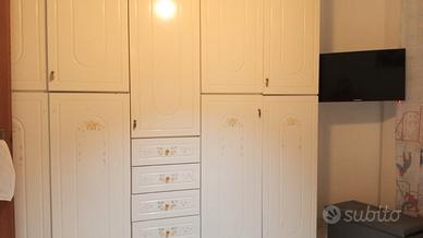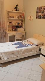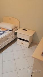 Vendo cameretta color bianco lucido con decorazioni composta da armadio a 5 ante con specchio interno,comodino con 2 cassetti ,Como con 3 cassetti e specchio ,libreria e 1 letto