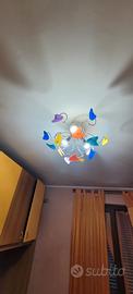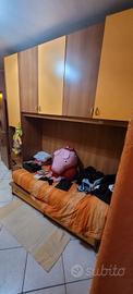 Cameretta di legno in buone condizioni che presenta solo qualche difetto: alcune ante necessitano di cerniere. Comprende tutti i mobili visibili, lampadario e letto con materasso, che presenta dei cassetti al di sotto.