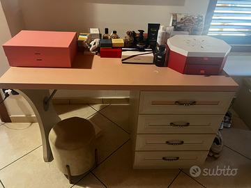 Cameretta Rosa completa con letto contenitore 1 piazza e mezza, armadio due ante e due cassetti, scrivania con cassetti completa di puffo, poltrona rosa abinata, specchio, puffo contenitore rosa