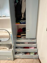 Propongo cameretta completa dal design moderno e funzionale, ideale per ottimizzare gli spazi senza rinunciare a comfort e praticità. La composizione, nelle eleganti tonalità azzurro polvere e bianco, è luminosa, neutra e facilmente abbinabile a qualsiasi stile di arredamento.