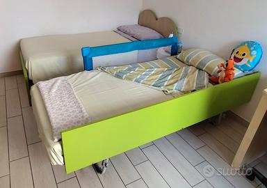 Cameretta completa composta da cabina armadio a due ante, una colonna laterale con cassetti e un doppia anta mezza altezza, letto con testiera a forma di cuore con letto estraibile, scrivania con cassetti.