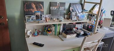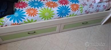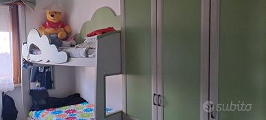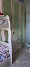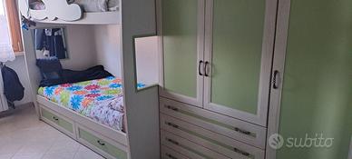 Cameretta ragazzi verde e frassino con letti a castello scala per salire scrivania compresa con sedia e cassettoni nel letto di sotto.