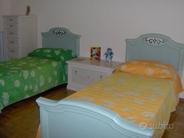 Testate in legno di colore verde mare, come l’armadio abbinato, con inserti in ferro battuto. Le dimensioni dei letti sono 205x95 cm. I letti sono dotati inoltre di reti ortopediche con doghe in legno.
