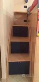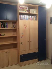 Vendo, causa trasloco, cameretta completa Colombini, in perfette condizioni. Come si può vedere dalle foto, la cameretta è color faggio e blu, ed è composta da un letto singolo alto, accessibile mediante una scaletta larga posteriore con cassettoni e sormontante un doppio armadio profondo, una parete armadio costituita da moduli componibili ed una scrivania con cassettiera, oltre a tre mensole.