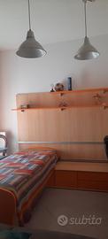 Cameretta salva spazio poiché sotto al letto più alto si inseriscono sia la scrivania in tutta la lunghezza sia l'altro letto . Posizione intercambiabile fra letti e scrivania ( fuori solo scrivania o solo il letto sottostante o fuori tutti e tre i pezzi) la base è composta da 4 cassetti e 2 sportelli