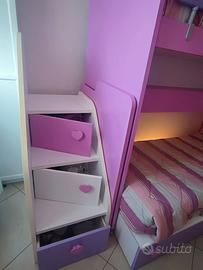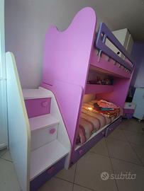 Vendo cameretta colombini in ottimo stato per inutilizzo, dotata di due letti con rete a doghe, scaletta con gradini contenitore, soppalco movibile facilmente come ruote e freni, passerella a scomparsa come da foto,letto superiore con barra di protezione e letto inferiore con due cassettoni.