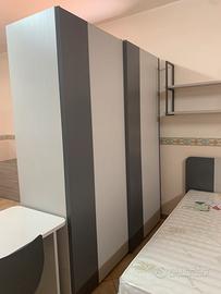 Armadio 2 ante scorrevoli, con cassettiera interna, h2,27m larghezza 180cm. Letto singolo per rete e materasso larghezza 90 cm. 1 comodino. Libreria a parete con scrivania da 135 cm con cassettiera e sedia girevole. SCONTO EXTRA 10%. Presente in sala mostra. Rete e materasso esclusi, trasporto e montaggio da concordare.