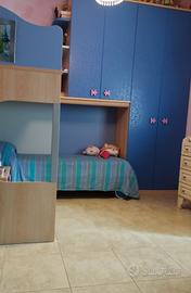 E' una cameretta dal design moderno e dallo stile elegante, caratterizzata da due letti, di cui quello a terra munito di ruote con freno, una scaletta con cassetti, un soppalco con vani contenitore muniti di anta a ribalta e un comodino con ruote, ad un cassetto.