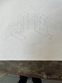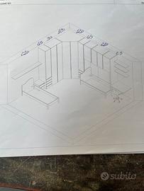 la camera dispone di una cabina armadio, 2 letti, una scrivania con sedia, un comodino, 4 mensole (3 sopra la scrivania, una sopra il letto).
