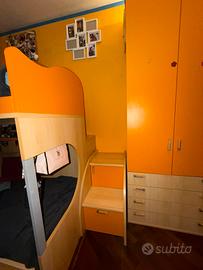 Vendo camera completa in ottime condizioni, composta da una pratica postazione studio con grande scrivania con due sedie, cassettiere integrate, mensole superiori e ampia libreria con vari ripiani, tutto coordinato in legno chiaro e arancione. Inclusi anche un letto a castello con due letti singoli, cassettoni molto capienti sotto il letto inferiore e un corridoietto laterale accanto al letto superiore con contenitori aggiuntivi, ideali per riporre giochi, vestiti o oggetti personali. Un armadio a due ante con cassetti abbastanza capiente. I cubi arancioni in totale sono 9 + 1 usato come comodino. La camera è solida, funzionale e perfetta per ottimizzare gli spazi. Nell’annuncio ho caricato sia le foto originali sia le foto in cui, grazie all’intelligenza artificiale, sono stati rimossi gli oggetti in modo da rendere i mobili più visibili. Per qualsiasi informazione sulle misure, dettagli aggiuntivi o ulteriori foto non esitate a contattarmi.