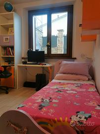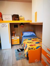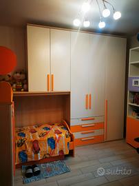 Vendo cameretta riprodotta in foto composta da tre letti (due a terra - uno color arancio e l'altro color glicine con 2 reti a doghe e 2 cassettoni - ed uno a ponte - sempre color arancio) 1 scrivania, 1 cassettiera- comodino, 6 cubolotti, 1 libreria con sportelli arancio glicine e 2 abat-jour. Vendo detta cameretta già smontata mediante ritiro diretto in loco o spedizione tramite corriere a carico acquirente.