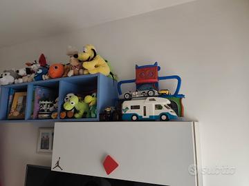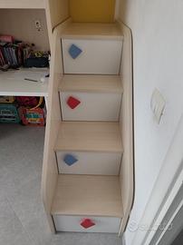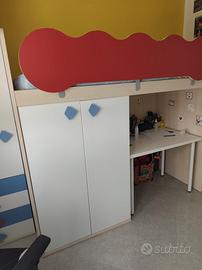 Cameretta colombini con letto a soppalco senza materasso, composta da scaletta con cassetti contenitori, cabina armadio sotto il letto, armadio con 4 cassetti, mobile contenitore sospeso e libreria sospesa. Lunghezza 3,15 metri con colonna armadio. La colonna armadio è larga 60 cm e può essere posizionata separatamente dal letto. Il letto è profondo 95 cm e la scaletta 1,65 metri. Disponibili maniglie e sponda in lilla per versione femminile. Smontaggio e ritiro a carico del committente. A disposizione per fornire dettagli e altre foto.