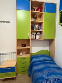 Cameretta colombini compista da lettino piu rete sotto il letto a scomparsa, comodino ,libreria, scrivania con cassetti e atmadio a 5 ante di cui una ad angolo piu due mensole colorate una blu e l altra verde completa di rete e due materassi