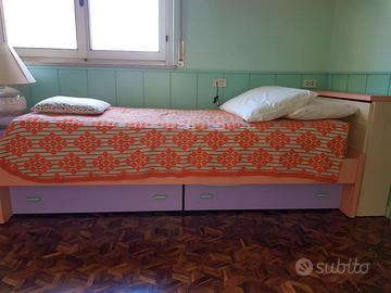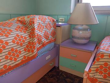 Vendo cameretta bambini come da foto in buono stato e ben tenuta. - due letti completi di rete a doghe e cassettoni doppi con ruote sotto il letto - due contenitori capienti in testa ad ogni letto - una cassettiera/comodino bassa - 4 mensole da muro
