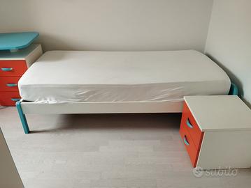 Vendo cameretta colorata composta da letto singolo, comodino, scrivania con cassetti e sedia.