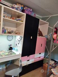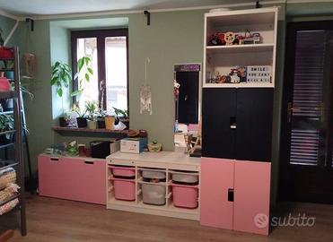 Vendo cameretta completa per bambini/e/ragazzi/e, molto capiente. Colori coordinati: Rosa, Nero e Bianco. L’offerta comprende 15 PEZZI totali: ZONA NOTTE E RELAX (3 pezzi): Letto a Castello in FERRO GRIGIO: Struttura a due piazze singole+2 materassi (uno nuovo e l'altro leggermente usato). Sedia da scrivania: Colore grigio scuro. Sedia Relax (OMAGGIO): In legno con rivestimento in tela e copertura. ARMADI E CONTENITORI (4 pezzi): 4. Armadio Grande (2 ante + 3 cassetti). 5. Armadio Grande (2 ante + 3 cassetti). 6. Armadio Medio (2 ante + 3 cassetti). 7. Grande Cassapanca: Con un unico cassettone profondo. ZONA STUDIO E CUBOTTI (8 pezzi): 8. Scrivania: Con cassetto lungo, cassetto piccolo e anta laterale. 9. Cassettiera Giocattoli: Struttura con 6 cassetti estraibili in plastica. 10. Cubotto Chiuso (2 ante e mensole interne). 11. Cubotto Chiuso (2 ante e mensole interne). 12. Cubotto Aperto (con 1 mensola interna). 13. Cubotto Aperto (con 1 mensola interna). 14. Cubotto Aperto (con 1 mensola interna). 15. Cubotto Aperto (senza mensole). CONDIZIONI: I mobili hanno circa 10 anni e presentano segni d'usura: Una sbeccatura nell'angolo in basso a sinistra di uno dei due armadi grandi. Lievi macchie sulla parte superiore della cassettiera porta-giochi (probabilmente facilmente removibili con prodotti appositi). Vedi difetti ultime due foto. RITIRO: Smontaggio e trasporto a carico dell'acquirente (disponibile per aiuto al carico). PREZZO: [600€] leggermente trattabile. NOTA: Su WhatsApp (+39 3288853446) posso inviare altre foto dettagliate. (Nell'annuncio non posso metterne più di sei)