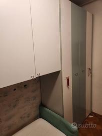 Cameretta completa armadio a ponte altezza 260cm. Lato lungo: lunghezza 375cm, profondità 60cm. Lato corto: lunghezza 100cm, profondità 40cm. Due letti 190x80cm, uno con doghe, uno con rete.