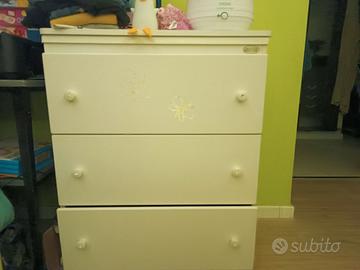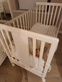 bellissima cameretta completa di lettino (con materasso, paracolpi e piumino con sacco) armadio due ante e due cassetti e fasciatoio con bagnetto e cassetti.