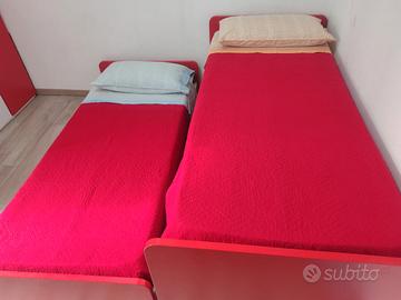 Vendo come da titolo cameretta bimbi composta da: Letti a scomparsa con doghe in legno ma senza materassi 90x205 e 90x200 il letto sopra da un po rumore. Armadio grande con ripiano ed appenderla h 185 l 80 p 56. Armadio più basso con tutti ripiani H 133 l 90 p 46. Cassettiera con 5 cassetti e 1 sportello H 70 l 130 p 46 Mobile Ikea cubotti Kallax colore rovere 3 x 4 112 x 147. Non metto foto perché pieno di libri