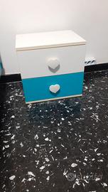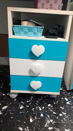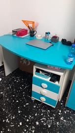 Cameretta completa composta da armadio con ante scorrevoli, letto con doghe in legno e comodino, scrivania con cassettiera.