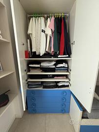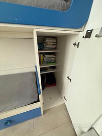 Vendo bellissima cameretta completa, realizzata su misura (valore d'acquisto originale circa 2500), in finitura moderno Bianco Frassino e Blu. La struttura è estremamente robusta, di qualità superiore rispetto ai modelli base, ed è stata tenuta con grandissima cura.
